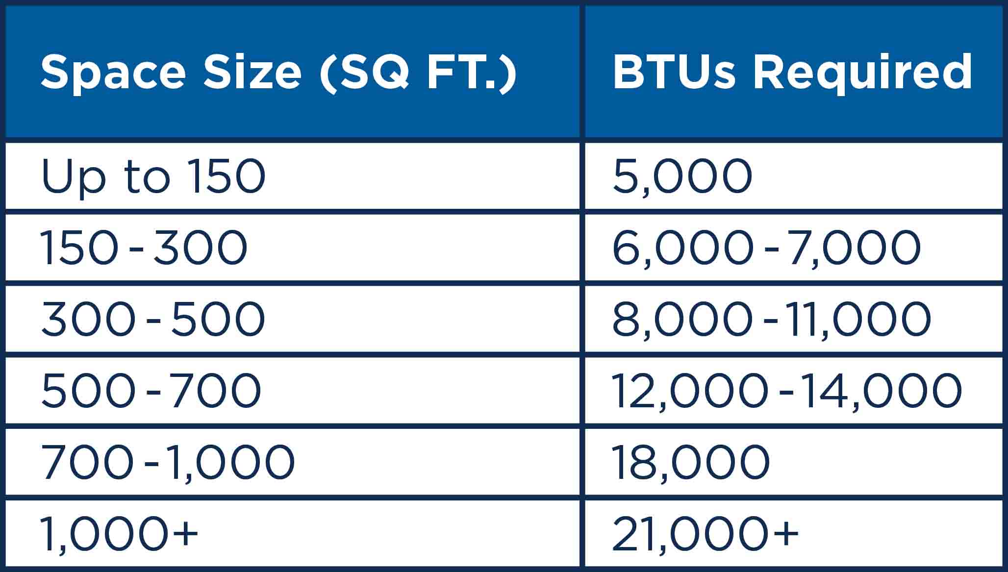 Use the table below to get an idea of how many BTUs you will need based on the size of your space.